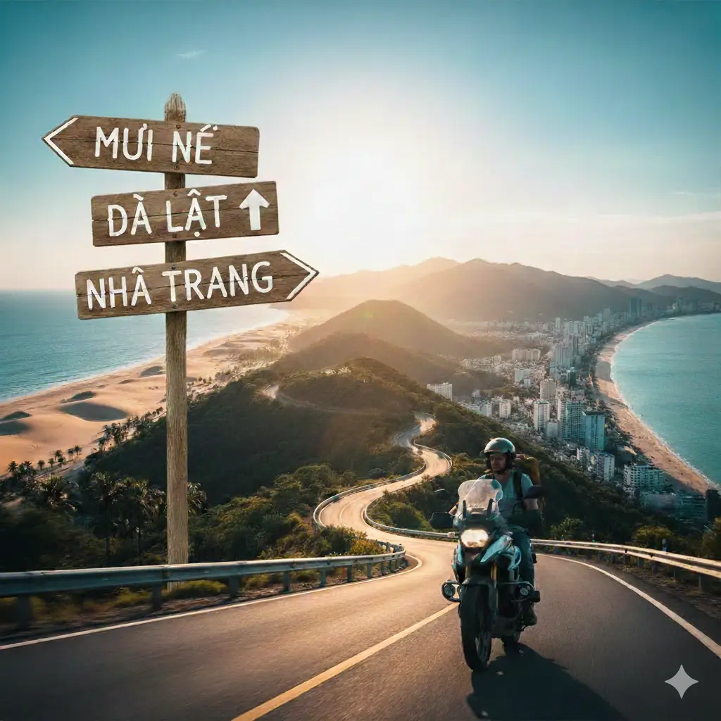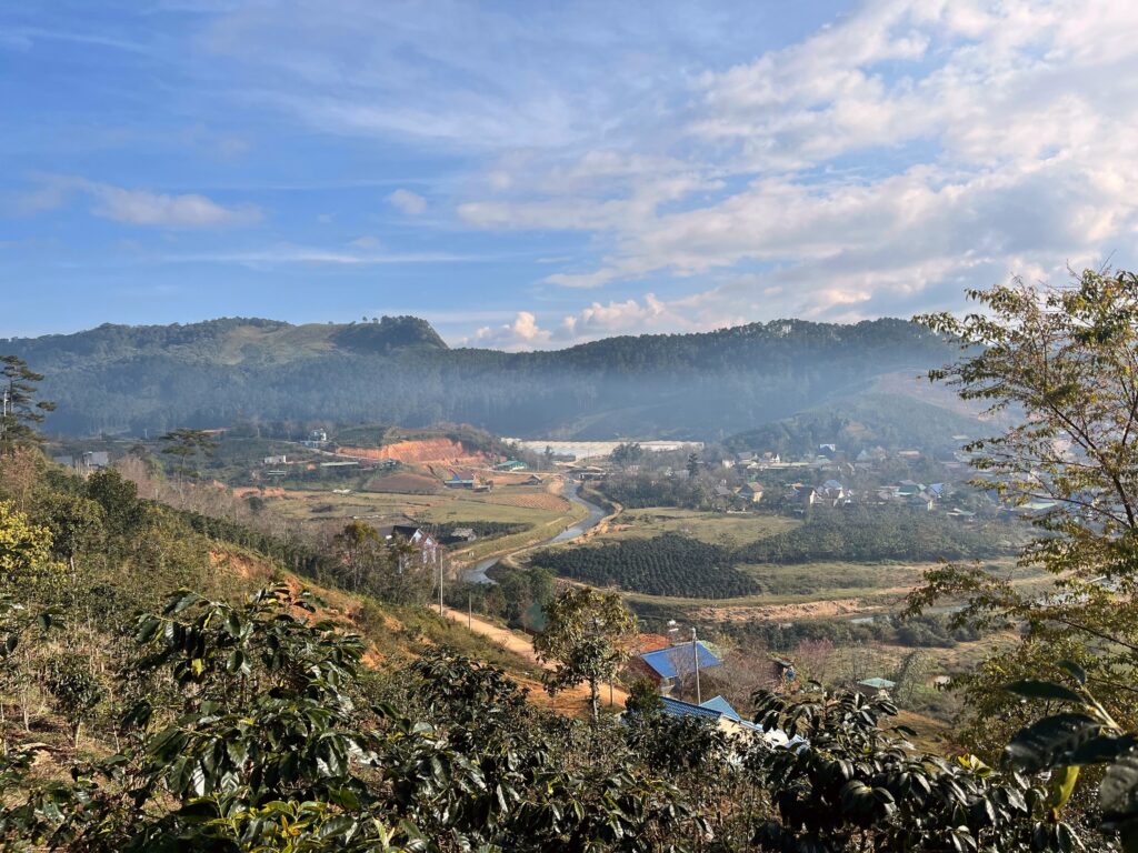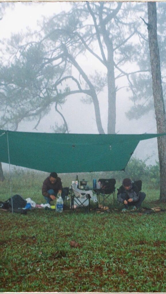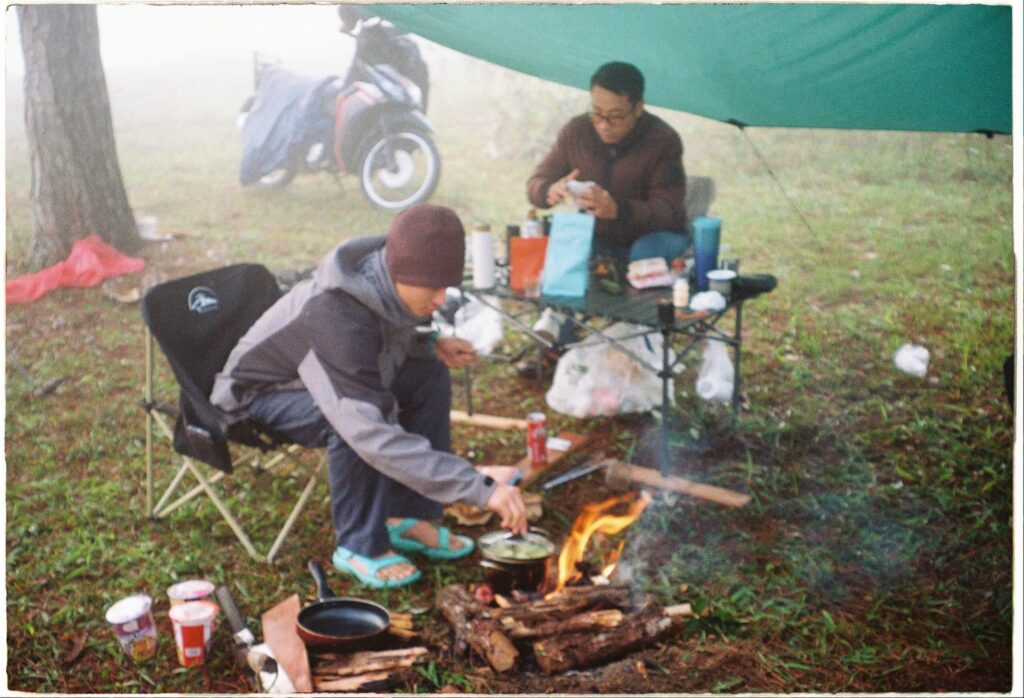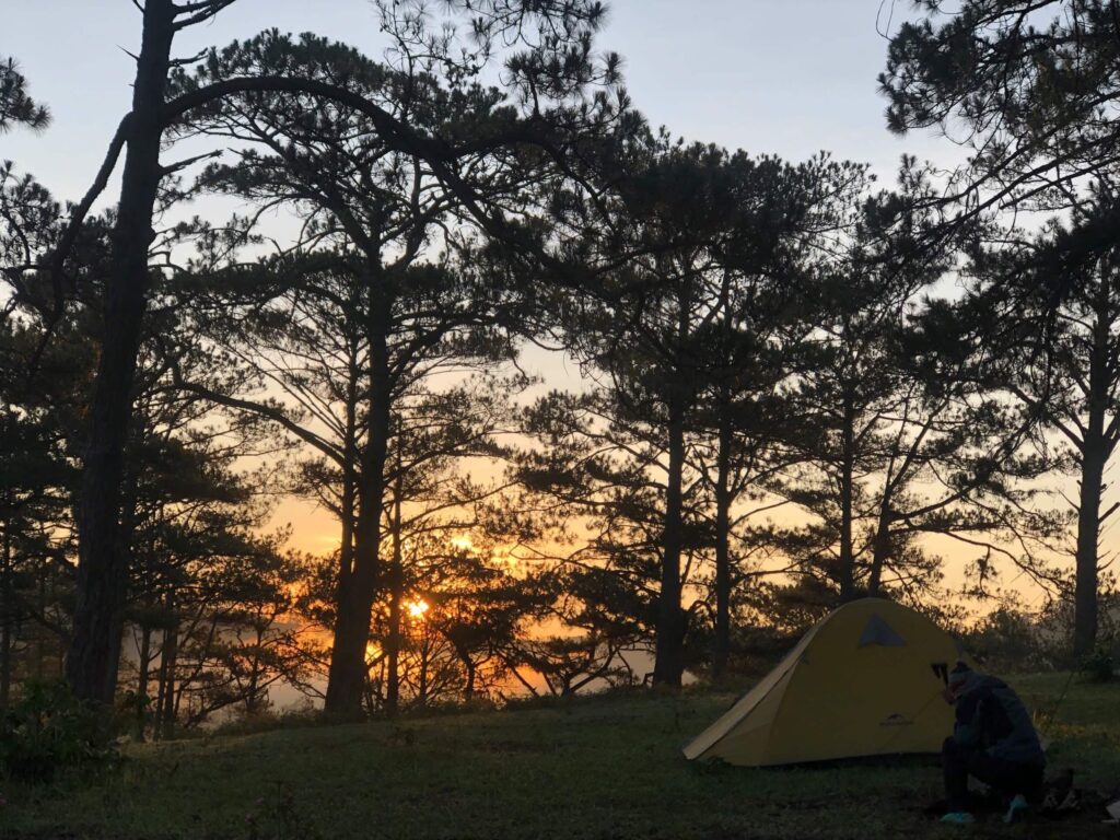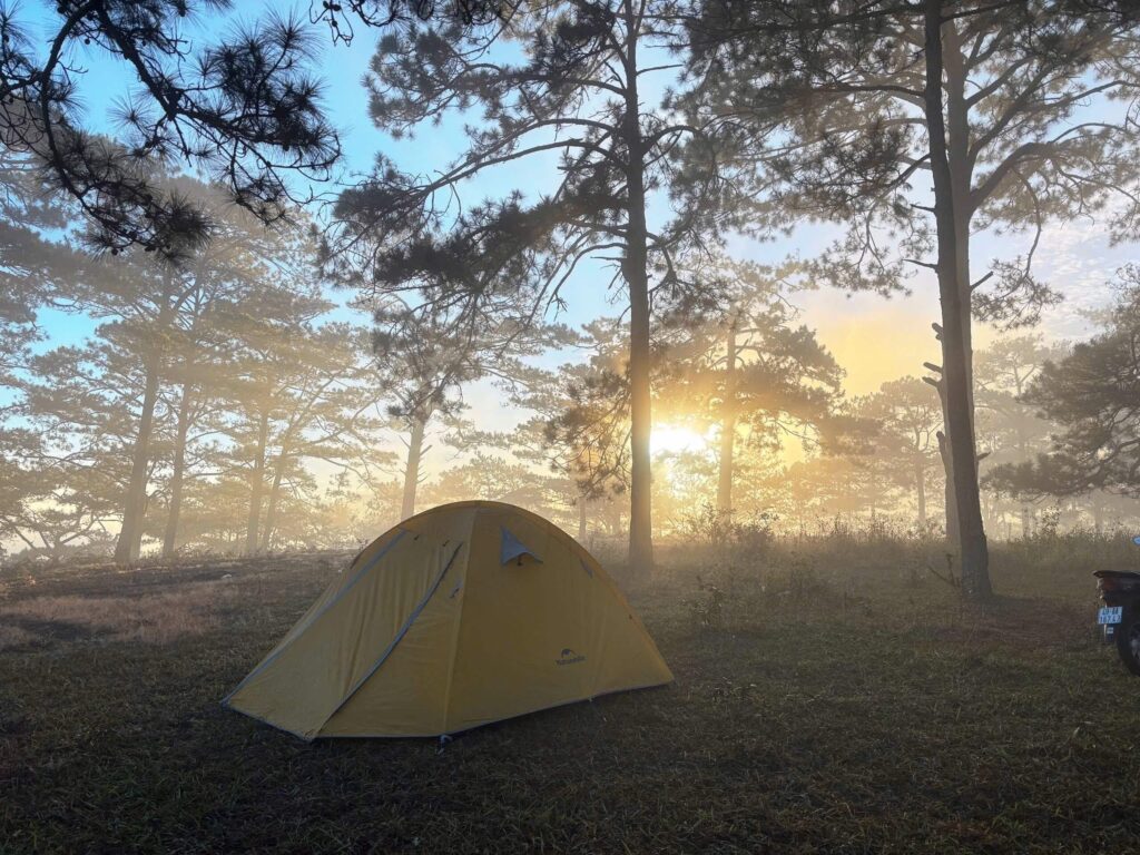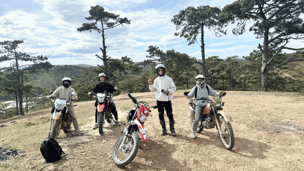 We meet in central Dalat, say hello to everyone, and do a quick safety and route briefing. Then we ride motorcycles through winding roads, pine forests, and coffee plantations to our cozy campsite.